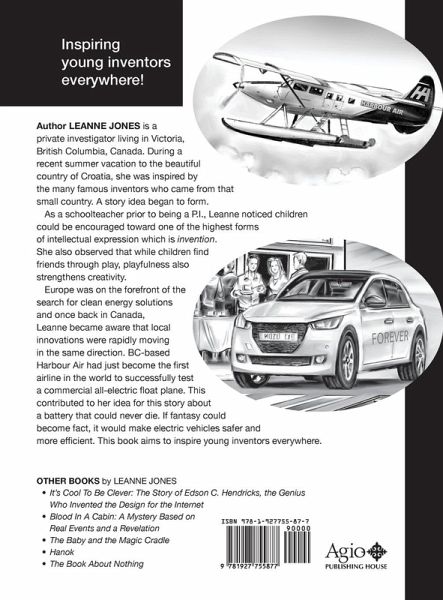 Inspiring young inventors everywhere! Author Leanne Jones is a private investigator living in Victoria, British Columbia, Canada. During a recent summer vacation to the beautiful country of Croatia, she was inspired by the many famous inventors who came from that small country. A story idea began to form. As a schoolteacher prior to being a P.I., Leanne noticed children could be encouraged toward one of the highest forms of intellectual expression which is invention. She also observed that while children find friends through play, playfulness also strengthens creativity. Europe was on the forefront of the search for clean energy solutions and once back in Canada, Leanne became aware that local innovations were rapidly moving in the same direction. BC-based Harbour Air had just become the first airline in the world to successfully test a commercial all-electric float plane. This contributed to her idea for this story about a battery that could never die. If fantasy could become fact, it would make electric vehicles safer and more efficient. This book aims to inspire young inventors everywhere. Illustrators The main illustrations are by Andrew A. Currie, an accomplished storyboard artist and illustrator who lives in Vancouver, BC. His strong sense of narrative and composition are clearly seen in all his works ranging from fine art to commercial illustration. See acartworks.com The illustration of dream-like fairies encircling the young Rhys napping under his favourite tree conveys the protection he feels, and reveals the subtle artistry of Marjorie Poole’s drawings. The illustration of dream-like visions – illuminating the mind of a young inventor – was drawn with magic realism by Victoria-based Anna Mah.