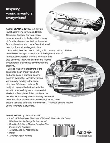 Inspiring young inventors everywhere! Author Leanne Jones is a private investigator living in Victoria, British Columbia, Canada. During a recent summer vacation to the beautiful country of Croatia, she was inspired by the many famous inventors who came from that small country. A story idea began to form. As a schoolteacher prior to being a P.I., Leanne noticed children could be encouraged toward one of the highest forms of intellectual expression which is invention. She also observed that while children find friends through play, playfulness also strengthens creativity. Europe was on the forefront of the search for clean energy solutions and once back in Canada, Leanne became aware that local innovations were rapidly moving in the same direction. BC-based Harbour Air had just become the first airline in the world to successfully test a commercial all-electric float plane. This contributed to her idea for this story about a battery that could never die. If fantasy could become fact, it would make electric vehicles safer and more efficient. This book aims to inspire young inventors everywhere. Illustrators The main illustrations are by Andrew A. Currie, an accomplished storyboard artist and illustrator who lives in Vancouver, BC. His strong sense of narrative and composition are clearly seen in all his works ranging from fine art to commercial illustration. See acartworks.com The illustration of dream-like fairies encircling the young Rhys napping under his favourite tree conveys the protection he feels, and reveals the subtle artistry of Marjorie Poole's drawings. The illustration of dream-like visions - illuminating the mind of a young inventor - was drawn with magic realism by Victoria-based Anna Mah.