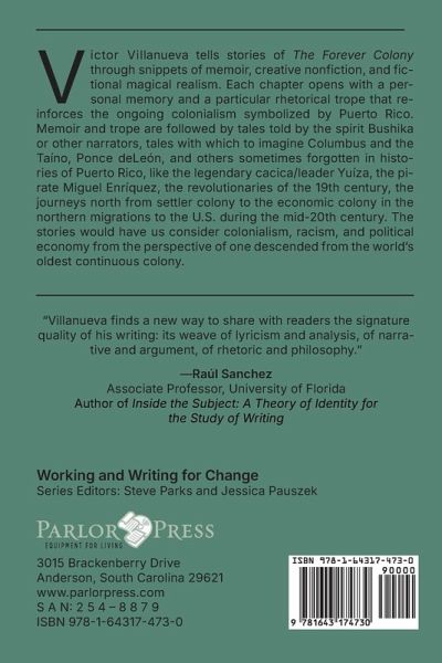 Working and Writing for Change Series Editors: Steve Parks and Jessica Pauszek Victor Villanueva tells stories of The Forever Colony through snippets of memoir, creative nonfiction, and fictional magical realism. Each chapter opens with a personal memory and a particular rhetorical trope that reinforces the ongoing colonialism symbolized by Puerto Rico. Memoir and trope are followed by tales told by the spirit Bushika or other narrators, tales with which to imagine Columbus and the Taíno, Ponce deLeón, and others sometimes forgotten in histories of Puerto Rico, like the legendary cacica/leader Yuíza, the pirate Miguel Enríquez, the revolutionaries of the 19th century, the journeys north from settler colony to the economic colony in the northern migrations to the U.S. during the mid-20th century. The stories would have us consider colonialism, racism, and political economy from the perspective of one descended from the world's oldest continuous colony. What People Are Saying "Villanueva finds a new way to share with readers the signature quality of his writing: its weave of lyricism and analysis, of narrative and argument, of rhetoric and philosophy." -Raúl Sanchez, Associate Professor, University of Florida and author of Inside the Subject: A Theory of Identity for the Study of Writing. About the Author Victor Villanueva is Regents Professor and Edward R. Meyer Distinguished Professor of Liberal Arts at Washington State University. He is the author, editor, or co-editor of eight books and nearly fifty articles or chapters in books. Among his books are the award-winning Bootstraps, From an American Academic of Color, Rhetorics of the Americas: 3114 BCE to 2013 CE, and Cross-Talk in Comp Theory: A Reader, one of the most-adopted books for the training of English teachers of writing in the U.S. and abroad.