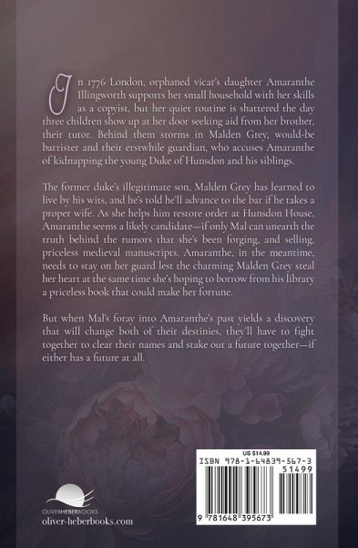 In 1776 London, orphaned vicar's daughter Amaranthe Illingworth supports her small household with her skills as a copyist, but her quiet routine is shattered the day three children show up at her door seeking aid from her brother, their tutor. Behind them storms in Malden Grey, would-be barrister and their erstwhile guardian, who accuses Amaranthe of kidnapping the young Duke of Hunsdon and his siblings. The former duke's illegitimate son, Malden Grey has learned to live by his wits, and he's told he'll advance to the bar if he takes a proper wife. As she helps him restore order at Hunsdon House, Amaranthe seems a likely candidate-if only Mal can unearth the truth behind the rumors that she's been forging, and selling, priceless medieval manuscripts. Amaranthe, in the meantime, needs to stay on her guard lest the charming Malden Grey steal her heart at the same time she's hoping to borrow from his library a priceless book that could make her fortune. But when Mal's foray into Amaranthe's past yields a discovery that will change both of their destinies, they'll have to fight together to clear their names and stake out a future together-if either has a future at all.