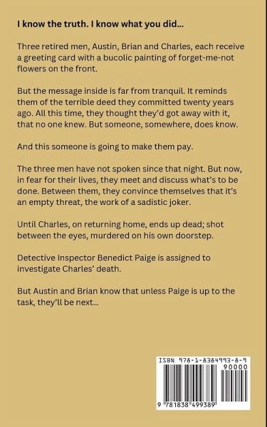 I know the truth. I know what you did... Three retired men, Austin, Brian and Charles, each receive a greeting card with a bucolic painting of forget-me-not flowers on the front. But the message inside is far from tranquil. It reminds them of the terrible deed they committed twenty years ago. All this time, they thought they'd got away with it, that no one knew. But someone, somewhere, does know. And this someone is going to make them pay. The three men have not spoken since that night. But now, in fear for their lives, they meet and discuss what's to be done. Between them, they convince themselves that it's an empty threat, the work of a sadistic joker. Until Charles, on returning home, ends up dead; shot between the eyes, murdered on his own doorstep. Detective Inspector Benedict Paige is assigned to investigate Charles' death. But Austin and Brian know that unless Paige is up to the task, they'll be next...