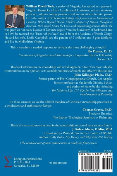 Stewardship is one of the essential means the church utilizes to roll up its sleeves and engage in the ministry it is challenged to do. — William Powell Tuck Jesus said in His sermon on the mountain, "Blessed are ..." (Matthew 5:1-12) James said, Faith without works is dead. (James 2:14-26) Dr. Bill Tuck shares his heart and his teachings on stewardship that will bring the reader into a greater appreciation of how God wants to use our time, talent and finances to build His Church as well as draw us into a deeper relationship with Him. You will find each chapter begins with a scriptural notation that will lend itself to further study and meditation on God's Word. May we be found to not only be reader of God's Word, but also doers of His Word.
