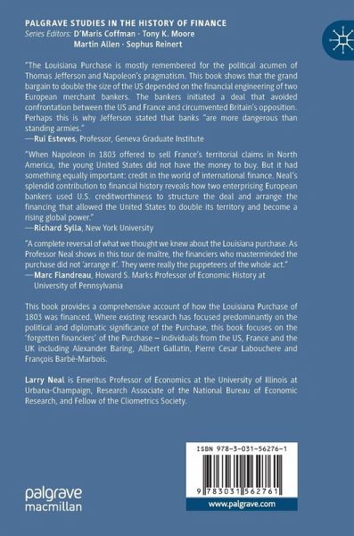 The book provides context and background for the Louisiana Purchase and examines the role of key actors and companies, focusing particularly on the 'forgotten financiers' of the Purchase - individuals from the US, France and the UK including Alexander Baring, Albert Gallatin, Pierre Cesar Labouchere and Francois Barbe-Marbois. Based on extensive, original archival research, the chapters will illuminate the role played by these individuals in bringing about financial innovation and facilitating a major transaction that doubled the size of the original United States and helped set the country on a path to global power. The book will be a valuable resource for historians of Europe and America, particularly those with interests in economic and financial history, as well as banking and finance scholars who are interested in the emergence of large-scale international finance in the 19th century.