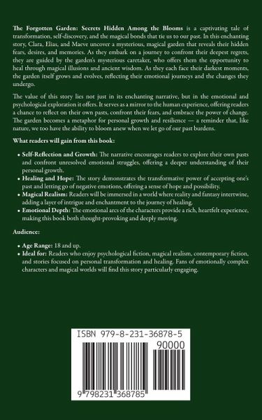 The Forgotten Garden: Secrets Hidden Among the Blooms is a captivating tale of transformation, self-discovery, and the magical bonds that tie us to our past. In this enchanting story, Clara, Elias, and Maeve uncover a mysterious, magical garden that reveals their hidden fears, desires, and memories. As they embark on a journey to confront their deepest regrets, they are guided by the garden's mysterious caretaker, who offers them the opportunity to heal through magical illusions and ancient wisdom. As they each face their darkest moments, the garden itself grows and evolves, reflecting their emotional journeys and the changes they undergo. The value of this story lies not just in its enchanting narrative, but in the emotional and psychological exploration it offers. It serves as a mirror to the human experience, offering readers a chance to reflect on their own pasts, confront their fears, and embrace the power of change. The garden becomes a metaphor for personal growth and resilience - a reminder that, like nature, we too have the ability to bloom anew when we let go of our past burdens. What readers will gain from this book:Self-Reflection and Growth: The narrative encourages readers to explore their own pasts and confront unresolved emotional struggles, offering a deeper understanding of their personal growth. Healing and Hope: The story demonstrates the transformative power of accepting one's past and letting go of negative emotions, offering a sense of hope and possibility. Magical Realism: Readers will be immersed in a world where reality and fantasy intertwine, adding a layer of intrigue and enchantment to the journey of healing. Emotional Depth: The emotional arcs of the characters provide a rich, heartfelt experience, making this book both thought-provoking and deeply moving. Audience:Age Range: 18 and up. Ideal for: Readers who enjoy psychological fiction, magical realism, contemporary fiction, and stories focused on personal transformation and healing. Fans of emotionally complex characters and magical worlds will find this story particularly engaging. Dive into a story that will awaken your soul, stir your imagination, and leave you forever changed - if it touched your heart, share your review and help others discover its magic.