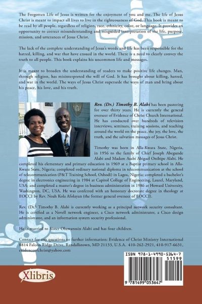 Rev. (Dr.) Timothy B. Alabi has been pastoring for over thirty years. He is currently the general overseer of Evidence of Christ Church International. He has conducted over hundreds of television interviews, seminars, training sessions, and teaching around the world on the peace, the joy, the love, the truth, and the salvation messages of Jesus Christ. Timothy was born in Alla-Kwara State, Nigeria, in 1956 to the family of Chief Joseph Abegunde Alabi and Madam Asabi Abigael Onibipe Alabi. He completed his elementary and primary education in 1969 at a Baptist primary school in Alla-Kwara State, Nigeria; completed ordinary national diploma in telecommunication at the school of telecommunication (P&T Training School, Oshodi) in Lagos, Nigeria; completed a bachelor's degree in electronics engineering in 1984 at Capitol College of Engineering, Laurel, Maryland, USA; and completed a master's degree in business administration in 1986 at Howard University, Washington, DC, USA. He was conferred with an honorary doctorate degree in theology at EOCCI by Rev. Noah Kola Afolayan (the former general overseer of EOCCI). Rev. (Dr.) Timothy B. Alabi is currently working as a principal network security consultant. He is certified as a Novell network engineer, a Cisco network administrator, a Cisco design administrator, and an information system security professional. He is married to Sister Oluwatosin Alabi and has four children.