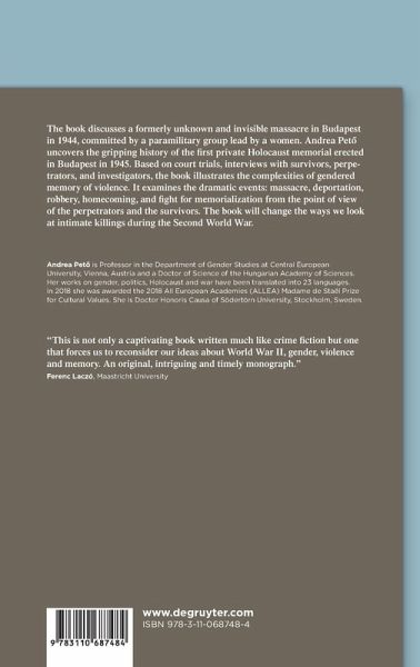 The book discusses a formerly unknown and invisible massacre in Budapest in 1944, committed by a paramilitary group lead by a women. Andrea Petö uncovers the gripping history of the fi rst private Holocaust memorial erected in Budapest in 1945. Based on court trials, interviews with survivors, perpetrators, and investigators, the book illustrates the complexities of gendered memory of violence. It examines the dramatic events: massacre, deportation, robbery, homecoming, and fi ght for memorialization from the point of view of the perpetrators and the survivors. The book will change the ways we look at intimate killings during the Second World-War.