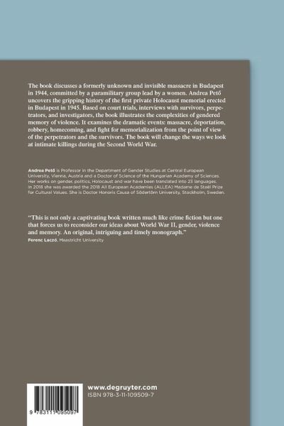 The book discusses a formerly unknown and invisible massacre in Budapest in 1944, committed by a paramilitary group lead by a women. Andrea Petö uncovers the gripping history of the fi rst private Holocaust memorial erected in Budapest in 1945. Based on court trials, interviews with survivors, perpetrators, and investigators, the book illustrates the complexities of gendered memory of violence. It examines the dramatic events: massacre, deportation, robbery, homecoming, and fi ght for memorialization from the point of view of the perpetrators and the survivors. The book will change the ways we look at intimate killings during the Second World-War.