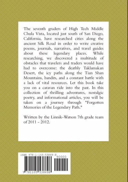 The seventh graders of High Tech Middle Chula Vista, located just south of San Diego, California, have researched cities along the ancient Silk Road in order to write creative poems, journals, narratives, and travel guides about these legendary places. While researching, we discovered a multitude of obstacles that travelers and traders would have had to overcome: the deathly Taklamakan Desert, the icy paths along the Tian Shan Mountains, bandits, and a constant battle with a lack of vital resources. Let this book take you on a caravan ride into the past. In this collection of thrilling adventures, nostalgic poetry, and informational articles, you will be taken on a journey through "Forgotten Memories of the Legendary Path."