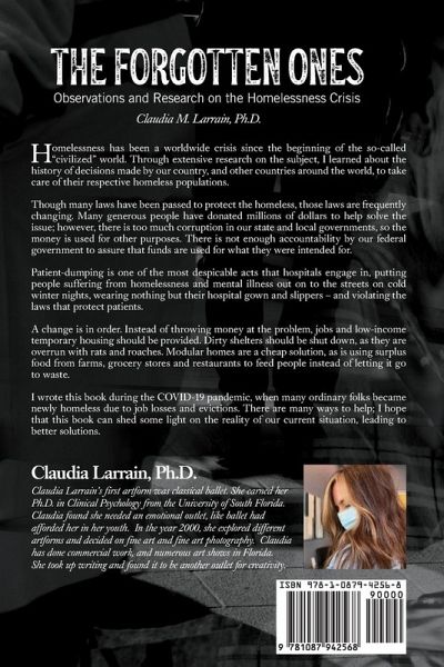 Claudia Larrain's "The Forgotten Ones" provides the latest research findings and observations of the homelessness crisis around the world. She summarizes the history of how many individuals ended up living in squalor. Many are mentally ill, who were thrown out of mental asylums due to overcrowding and unethical treatments. However, a contingency plan was never put in place to deal with serious mental illnesses and they ended up living on the streets. Another large population of homeless is the Vietnam Veterans, who's situation is improving, however, there are many more homeless in all of our cities since it became a problem in the 20th century. Now with the COVID-19 epidemic, people are falling into poverty and ultimately homelessness. The problem is getting worse. Larrain studied the efficacy of many approaches to solve homelessness and recommends methods that will help homeless individuals find work and re-enter society as functional, useful and proud people.
