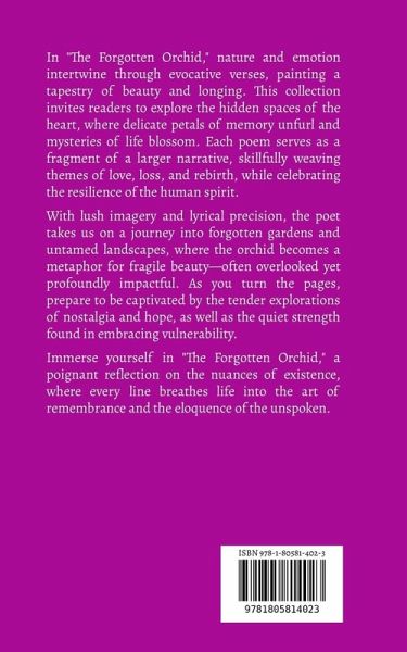 In "The Forgotten Orchid," nature and emotion intertwine through evocative verses, painting a tapestry of beauty and longing. This collection invites readers to explore the hidden spaces of the heart, where delicate petals of memory unfurl and mysteries of life blossom. Each poem serves as a fragment of a larger narrative, skillfully weaving themes of love, loss, and rebirth, while celebrating the resilience of the human spirit. With lush imagery and lyrical precision, the poet takes us on a journey into forgotten gardens and untamed landscapes, where the orchid becomes a metaphor for fragile beauty-often overlooked yet profoundly impactful. As you turn the pages, prepare to be captivated by the tender explorations of nostalgia and hope, as well as the quiet strength found in embracing vulnerability. Immerse yourself in "The Forgotten Orchid," a poignant reflection on the nuances of existence, where every line breathes life into the art of remembrance and the eloquence of the unspoken.