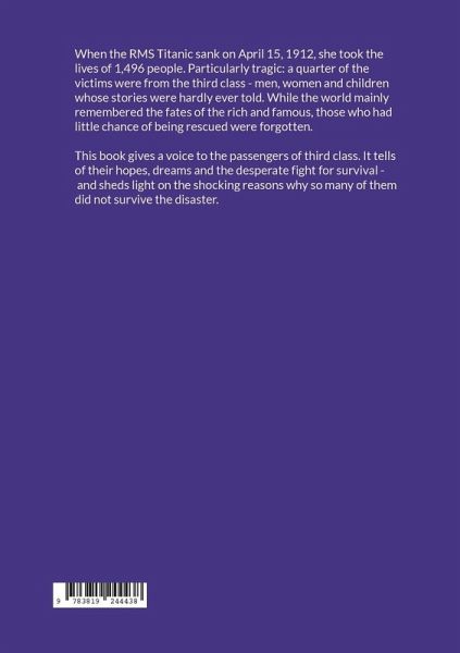 When the RMS Titanic sank on April 15, 1912, she took the lives of 1,496 people. Particularly tragic: a quarter of the victims were from the third class - men, women and children whose stories were hardly ever told. While the world mainly remembered the fates of the rich and famous, those who had little chance of being rescued were forgotten. This book gives a voice to the passengers of third class. It tells of their hopes, dreams and the desperate fight for survival - and sheds light on the shocking reasons why so many of them did not survive the disaster.
