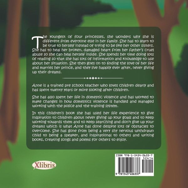 The youngest of four princesses, she wonders why she is different from everyone else in her family. She has to learn to be true to herself instead of trying to be like her other sisters. She has to heal her broken, damaged heart from her fathers cruel abuse so she can heal herself inside. She spends her time doing lots of reading so that she has lots of information and knowledge to use about her situation. She then goes on to finding the love of her life and marries her prince, and they live happily ever after, never giving up their dreams.