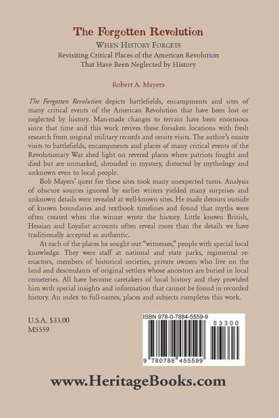 The Forgotten Revolution depicts battlefields, encampments and sites of many critical events of the American Revolution that have been lost or neglected by history. Man-made changes to terrain have been enormous since that time and this work revives these forsaken locations with fresh research from original military records and onsite visits. The author's onsite visits to battlefields, encampments and places of many critical events of the Revolutionary War shed light on revered places where patriots fought and died but are unmarked, shrouded in mystery, distorted by mythology and unknown even to local people. Bob Mayers' quest for these sites took many unexpected turns. Analysis of obscure sources ignored by earlier writers yielded many surprises and unknown details were revealed at well-known sites. He made detours outside of known boundaries and textbook timelines and found that myths were often created when the winner wrote the history. Little known British, Hessian and Loyalist accounts often reveal more than the details we have traditionally accepted as authentic. At each of the places he sought out "witnesses," people with special local knowledge. They were staff at national and state parks, regimental re-enactors, members of historical societies, private owners who live on the land and descendants of original settlers whose ancestors are buried in local cemeteries. All have become caretakers of local history and they provided him with special insights and information that cannot be found in recorded history. An index to full-names, places and subjects completes this work.