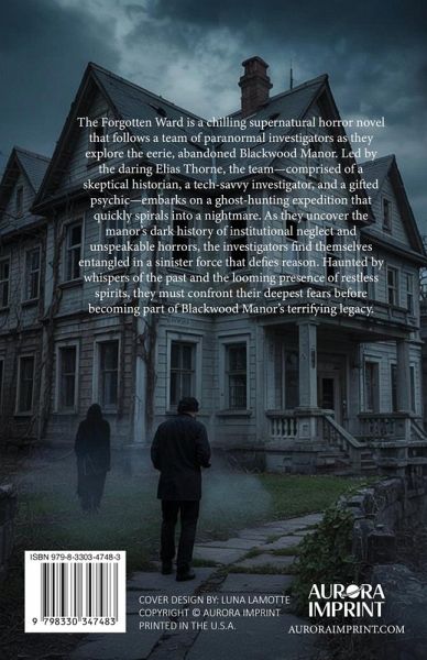 The Forgotten Ward is a chilling supernatural horror novel that follows a team of paranormal investigators as they explore the eerie, abandoned Blackwood Manor. Led by the daring Elias Thorne, the team-comprised of a skeptical historian, a tech-savvy investigator, and a gifted psychic-embarks on a ghost-hunting expedition that quickly spirals into a nightmare. As they uncover the manor's dark history of institutional neglect and unspeakable horrors, the investigators find themselves entangled in a sinister force that defies reason. Haunted by whispers of the past and the looming presence of restless spirits, they must confront their deepest fears before becoming part of Blackwood Manor's terrifying legacy.