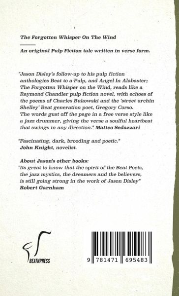 Jason Disley's follow-up to his pulp fiction anthologies Beat to a Pulp, and Angel In Alabaster; The Forgotten Whisper on the Wind, reads like a Raymond Chandler pulp fiction novel, with echoes of the poems of Charles Bukowski and the 'street urchin Shelley' Beat generation poet, Gregory Corso.