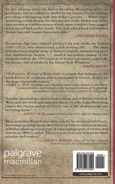 "In The Forgotten Writings of Bram Stoker, John Edgar Browning gathers Stoker's early poetry, some of his journalism, several interviews, a number of trivial short stories, the catalogue of his library, and many other odds and ends. Yet what surprises most in these pages is the humor, sometimes sentimental, sometimes macabre, sometimes utterly fanciful." - The Washington Post
