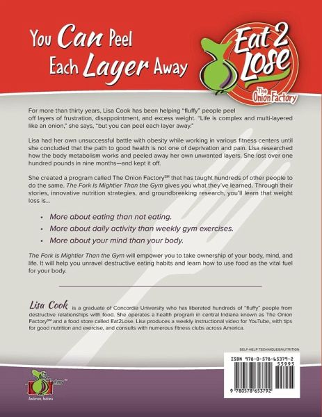 For 35 years, Lisa Cook has been helping "fluffy" people peel off layers of frustration, disappointment, and excess weight. "Life is complex and multi-layered like an onion," she says, "but you can peel each layer away." Lisa knows this firsthand. She had her own unsuccessful battle with obesity while working in various fitness centers until she concluded that the path to good health is scientific and psychological. She applied what she learned to lose over one hundred pounds in nine months--and kept it off! She began a program called "The Onion Factory," which has taught hundreds of others to do the same. This book gives you what they've learned. Its innovative nutrition strategies reveal that weight loss is... ...more about eating than not eating. ...more about daily activity than weekly gym exercises. ...more about your mind than your body. The Fork Is Mightier Than the Gym will empower you to take ownership of your body, mind, and life. It unravels destructive eating habits and teaches you how to use food as the vital fuel for your body.