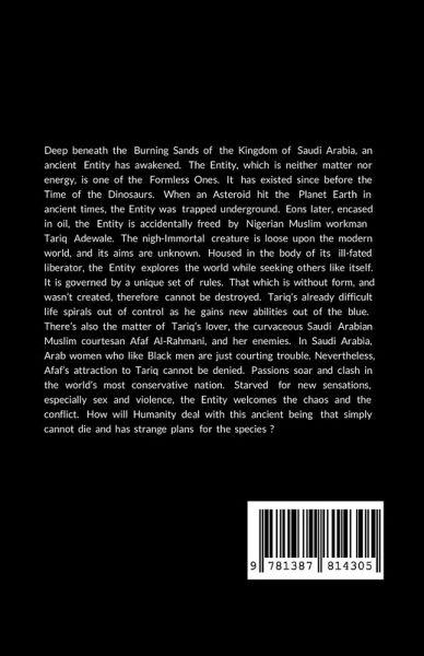 Deep beneath the Burning Sands of the Kingdom of Saudi Arabia, an ancient Entity has awakened. The Entity, which is neither matter nor energy, is one of the Formless Ones. It has existed since before the Time of the Dinosaurs. When an Asteroid hit the Planet Earth in ancient times, the Entity was trapped underground. Eons later, encased in oil, the Entity is accidentally freed by Nigerian Muslim workman Tariq Adewale. The nigh-Immortal creature is loose upon the modern world, and its aims are unknown. Housed in the body of its ill-fated liberator, the Entity explores the world while seeking others like itself. It is governed by a unique set of rules. That which is without form, and wasn't created, therefore cannot be destroyed. Tariq's already difficult life spirals out of control as he gains new abilities out of the blue. There's also the matter of Tariq's lover, the curvaceous Saudi Arabian Muslim courtesan Afaf Al-Rahmani, and her enemies. In Saudi Arabia, Arab women who like Black men are just courting trouble. Nevertheless, Afaf's attraction to Tariq cannot be denied. Passions soar and clash in the world's most conservative nation. Starved for new sensations, especially sex and violence, the Entity welcomes the chaos and the conflict. How will Humanity deal with this ancient being that simply cannot die and has strange plans for the species ?