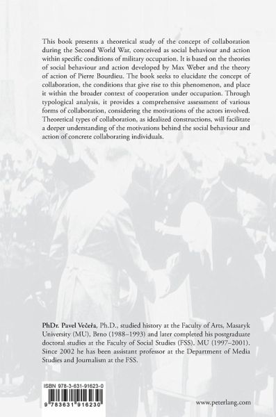 This book aims to present a theoretical study of the concept of collaboration during the Second World War, understood as social behaviour and actions within specific conditions of military occupation. It is based on the theories of social behaviour and action developed by Max Weber and the theory of action by Pierre Bourdieu. The book seeks to elucidate the concept of collaboration, the conditions fostering this phenomenon, and positions it within the broader context of cooperation under occupation. Through typological analysis, it provides a comprehensive assessment of various forms of collaboration, considering the motivations of the actors involved. Theoretical types of collaboration, as idealized constructions, will facilitate a deeper understanding of the motivations behind the social behaviour and actions of specific collaborating individuals.