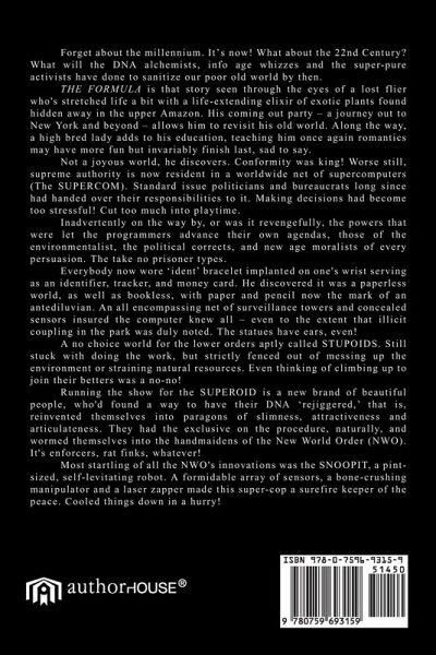 Forget about the millennium. It¿s now! What about the 22nd Century? What will the DNA alchemists, info age whizzes and the super-pure activists have done to sanitize our poor old world by then. THE FORMULA is that story seen through the eyes of a lost flier who's stretched life a bit with a life-extending elixir of exotic plants found hidden away in the upper Amazon. His coming out party ¿ a journey out to New York and beyond ¿ allows him to revisit his old world. Along the way, a high bred lady adds to his education, teaching him once again romantics may have more fun but invariably finish last, sad to say. Not a joyous world, he discovers. Conformity was king! Worse still, supreme authority is now resident in a worldwide net of supercomputers (The SUPERCOM). Standard issue politicians and bureaucrats long since had handed over their responsibilities to it. Making decisions had become too stressful! Cut too much into playtime. Inadvertently on the way by, or was it revengefully, the powers that were let the programmers advance their own agendas, those of the environmentalist, the political corrects, and new age moralists of every persuasion. The take no prisoner types. Everybody now wore ¿ident¿ bracelet implanted on one's wrist serving as an identifier, tracker, and money card. He discovered it was a paperless world, as well as bookless, with paper and pencil now the mark of an antediluvian. An all encompassing net of surveillance towers and concealed sensors insured the computer knew all ¿ even to the extent that illicit coupling in the park was duly noted. The statues have ears, even! A no choice world for the lower orders aptly called STUPOIDS. Still stuck with doing the work, but strictly fenced out of messing up the environment or straining natural resources. Even thinking of climbing up to join their betters was a no-no! Running the show for the SUPEROID is a new brand of beautiful people, who'd found a way to have their DNA ¿rejiggered,¿ that is, reinvented themselves into paragons of slimness, attractiveness and articulateness. They had the exclusive on the procedure, naturally, and wormed themselves into the handmaidens of the New World Order (NWO). It's enforcers, rat finks, whatever! Most startling of all the NWO's innovations was the SNOOPIT, a pint-sized, self-levitating robot. A formidable array of sensors, a bone-crushing manipulator and a laser zapper made this super-cop a surefire keeper of the peace. Cooled things down in a hurry!
