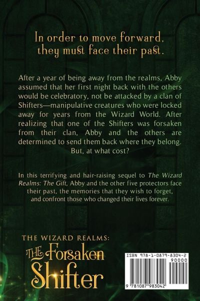 In Order to Move Forward, They Must Face Their Past. After a year of being away from the realms, Abby assumed that her first night back with the others would be celebratory, not be attacked by a clan of Shifters-manipulative creatures who were locked away for years from the Wizard World. After realizing that one of the Shifters was forsaken from their clan, Abby and the others are determined to send them back where they belong. But, at what cost? In this terrifying and hair-raising sequel to The Wizard Realms: The Gift, Abby and the other five protectors face their past, the memories that they wish to forget, and confront those who changed their lives forever.