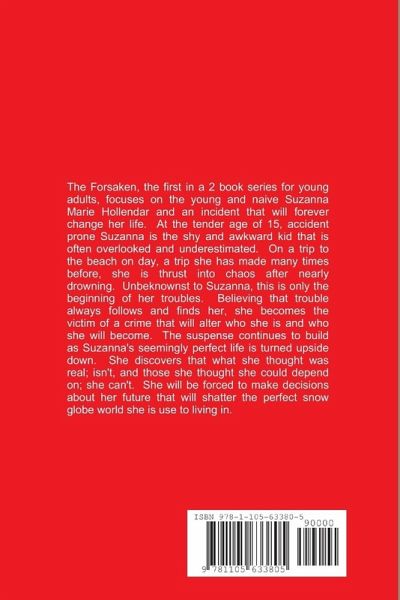The Forsaken, the first in a 2 book series for young adults, focuses on the young and naïve Suzanna Marie Hollendar and an incident that will forever change her life. At the tender age of fifteen, accident prone Suzanna is the shy awkward kid that is often overlooked and underestimated. On a trip to the beach one day, a trip she has made many times before, she is thrust into chaos after nearly drowning. Unbeknownst to Suzanna, this is only the beginning of her troubles. Believing that trouble always follows and finds her,she becomes the victim of a crime that will alter who she is and who she will become. The suspense continues to build as Suzanna's seemingly perfect life is turned upside down. She discovers that what she thought was real; isn't, and those she thought she could always count on; she can't. She will be forced to make decisions about her future that will shatter the perfect snow globe world she has always lived in.