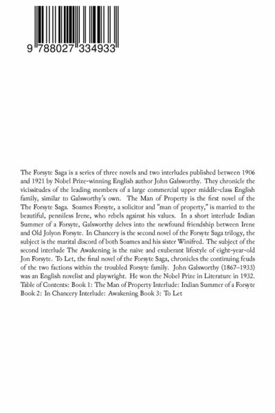 The Forsyte Saga is a series of three novels and two interludes published between 1906 and 1921 by Nobel Prize-winning English author John Galsworthy. They chronicle the vicissitudes of the leading members of a large commercial upper middle-class English family, similar to Galsworthy's own. The Man of Property is the first novel of the The Forsyte Saga. Soames Forsyte, a solicitor and "man of property," is married to the beautiful, penniless Irene, who rebels against his values. In a short interlude Indian Summer of a Forsyte, Galsworthy delves into the newfound friendship between Irene and Old Jolyon Forsyte. In Chancery is the second novel of the Forsyte Saga trilogy, the subject is the marital discord of both Soames and his sister Winifred. The subject of the second interlude The Awakening is the naive and exuberant lifestyle of eight-year-old Jon Forsyte. To Let, the final novel of the Forsyte Saga, chronicles the continuing feuds of the two factions within the troubled Forsyte family. John Galsworthy (1867-1933) was an English novelist and playwright. He won the Nobel Prize in Literature in 1932. Table of Contents: Book 1: The Man of Property Interlude: Indian Summer of a Forsyte Book 2: In Chancery Interlude: Awakening Book 3: To Let