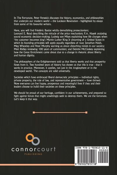 In The Fortunate, Peter Fenwick discusses the history, economics, and philosophies that underpin our modern world - the Lockean Revolution - highlighted by essays from some of his favourite writers. Here, you will find Frédéric Bastiat wittily demolishing protectionism; Leonard E. Read describing the miracle of the price mechanism; F.A. Hayek analysing sound economic decision-making; Ludwig von Mises explaining how life changes when 'the customer becomes king'; Martin Luther King Jr dreaming of a United States in which its founding principles will apply equally regardless of race; Jonathan Haidt, Meg Wheatley and Peter Murphy warning us about disturbing trends in our society; Matt Ridley reviewing 100 years of communism; and Deirdre McCloskey explaining how the Great Enrichment came about due to a change in rhetoric about liberty and human dignity. The philosophers of the Enlightenment told us that liberty works and that prosperity flows from it. Two hundred years of history has shown us that this is true - that it works in practice. Moreover, it applies, not just in the Anglosphere or in the developed world. The concepts are valid universally. Societies which have embraced liberal democratic principles - individual rights, private property, the rule of law, and representative government - have thrived. Now everyone can live happy, prosperous and meaningful lives if they and their leaders choose to build their societies on these principles. We should be proud of our heritage, confident in our achievements, and prepared to fight against forces that might unwittingly seek to destroy them. We are the fortunate. Let's keep it that way.