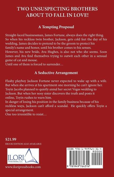 Two unsuspecting brothers about to fall in love! A Tempting Proposal Straight-laced businessman, James Fortune, always does the right thing. So when his reckless twin brother, Jackson, gets cold feet the day of his wedding, James decides to pretend to be the groom to protect his family's name and honor, until his brother comes to his senses. However, his new bride, Ava Hughes, is also not who she seems. Soon James and Ava find themselves trying to outwit each other in a sensual game of cat and mouse. Until one of them is forced to surrender… A Seductive Arrangement Flashy playboy Jackson Fortune never expected to wake up with a wife. But when she arrives at his apartment one morning he can't ignore her. Toyin Jacobs planned to quietly annul her secret Vegas wedding to Jackson. But when her nosy sister discovers the truth and posts it online, Toyin rushes to warn him. In danger of losing his position in the family business because of his reckless ways, Jackson can't afford a scandal. He quickly offers Toyin a special arrangement. One too irresistible to resist…