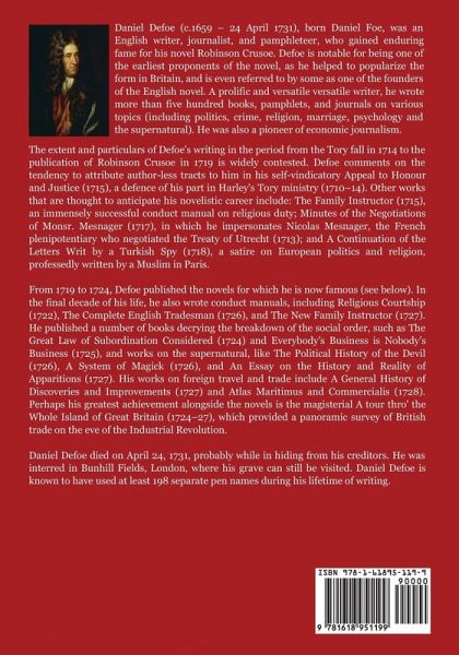Daniel Defoe (1660 - 1731), born Daniel Foe, was an English trader, writer, journalist, pamphleteer and spy, most famous for his novel Robinson Crusoe. Defoe is noted for being one of the earliest proponents of the novel, as he helped to popularize the form in Britain with others such as Samuel Richardson and is among the founders of the English novel. He was a prolific and versatile writer, producing more than five hundred books, pamphlets, and journals on various topics, including politics, crime, religion, marriage, psychology and the supernatural. He was also a pioneer of economic journalism.