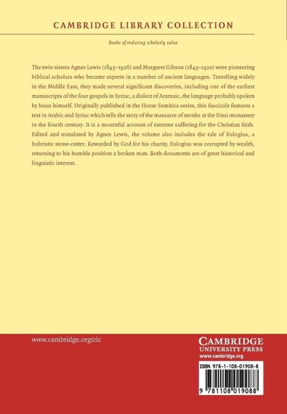 The twin sisters Agnes Lewis (1843-1926) and Margaret Gibson (1843-1920) were pioneering biblical scholars who became experts in a number of ancient languages. Travelling widely in the Middle East, they made several significant discoveries, including one of the earliest manuscripts of the four gospels in Syriac, a dialect of Aramaic, the language probably spoken by Jesus himself. Originally published in the Horae Semitica series, this fascicule features a text in Arabic and Syriac which tells the story of the massacre of monks at the Sinai monastery in the fourth century. It is a mournful account of extreme suffering for the Christian faith. Edited and translated by Agnes Lewis, the volume also includes the tale of Eulogius, a hubristic stone-cutter. Rewarded by God for his charity, Eulogius was corrupted by wealth, returning to his humble position a broken man. Both documents are of great historical and linguistic interest.