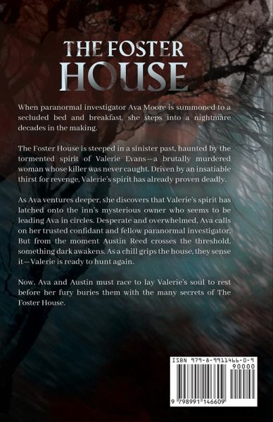 Paranormal investigator, Ava Moore, is drawn into a web of ghostly terror when she is summoned to a bed and breakfast in a secluded Arkansas town. The Foster House, shrouded in a dark history, holds the tormented spirit of Valerie Evans, a woman brutally murdered in the 1950s, her killer never apprehended. Now, Valerie's spirit haunts the inn, consumed by the thirst for revenge. As Ava ventures deeper into the mysteries of The Foster House, she discovers that the spirit of Valerie has latched onto the mysterious owner, Mike, who harbors secrets that hold the key to saving lives. Overwhelmed and in desperate need of assistance, Ava reaches out to her trusted confidant and fellow paranormal investigator, Austin Reed. Little do they know, Austin's involvement plunges him headlong into grave danger, as his resemblance to Valerie's previous victims places his life on the line. Ava and Austin race against time, desperately searching for a means to lay Valerie's restless soul to rest before she claims more innocent lives. As they delve into the secrets of The Foster House, they must confront the darkness that surrounds them and unlock the truth that lies buried within its walls. Will Ava and Austin unravel the mystery of Valerie's murder, or will they become her next victims in this battle of life and death against a spirit hungry for vengeance?