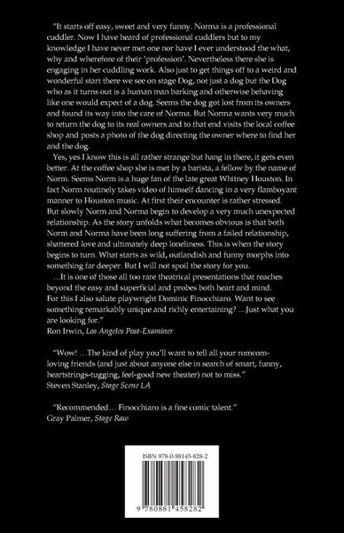 "It starts off easy, sweet and very funny. Norma is a professional cuddler. Now I have heard of professional cuddlers but to my knowledge I have never met one nor have I ever understood the what, why and wherefore of their `profession’. Nevertheless there she is engaging in her cuddling work. Also just to get things off to a weird and wonderful start there we see on stage Dog, not just a dog but the Dog who as it turns out is a human man barking and otherwise behaving like one would expect of a dog. Seems the dog got lost from its owners and found its way into the care of Norma. But Norma wants very much to return the dog to its real owners and to that end visits the local coffee shop and posts a photo of the dog directing the owner where to find her and the dog. Yes, yes I know this is all rather strange but hang in there, it gets even better. At the coffee shop she is met by a barista, a fellow by the name of Norm. Seems Norm is a huge fan of the late great Whitney Houston. In fact Norm routinely takes video of himself dancing in a very flamboyant manner to Houston music. At first their encounter is rather stressed. But slowly Norm and Norma begin to develop a very much unexpected relationship. As the story unfolds what becomes obvious is that both Norm and Norma have been long suffering from a failed relationship, shattered love and ultimately deep loneliness. This is when the story begins to turn. What starts as wild, outlandish and funny morphs into something far deeper. But I will not spoil the story for you. …It is one of those all too rare theatrical presentations that reaches beyond the easy and superficial and probes both heart and mind. For this I also salute playwright Dominic Finocchiaro. Want to see something remarkably unique and richly entertaining? …Just what you are looking for." Ron Irwin, Los Angeles Post-Examiner "Wow! …The kind of play you’ll want to tell all your romcom-loving friends (and just about anyone else in search of smart, funny, heartstrings-tugging, feel-good new theater) not to miss." Steven Stanley, Stage Scene LA "Recommended… Finocchiaro is a fine comic talent." Gray Palmer, Stage Raw