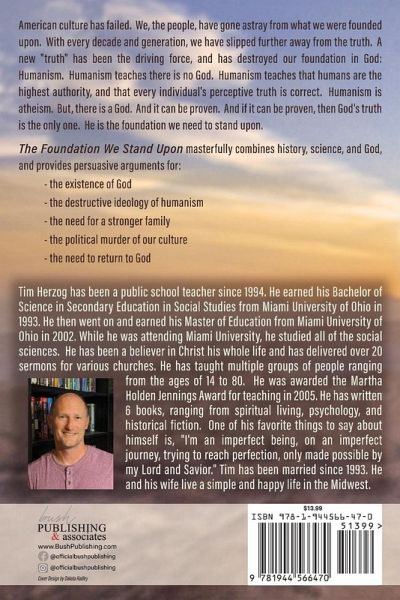 American culture has failed. We, the people, have gone astray from what we were founded upon. With every decade and generation, we have slipped further away from the truth. A new "truth" has been the driving force, and has destroyed our foundation in God: Humanism. Humanism teaches there is no God. Humanism teaches that humans are the highest authority and that every individual's perceptive truth is correct. Humanism is atheism. But, there is a God. And it can be proven. And if it can be proven, then God's truth is the only one. He is the foundation we need to stand upon. The Foundation We Stand Upon masterfully combines history, science, and God, and provides persuasive arguments for: - the existence of God - the destructive ideology of humanism - the need for a stronger family - the political murder of our culture - the need to return to God