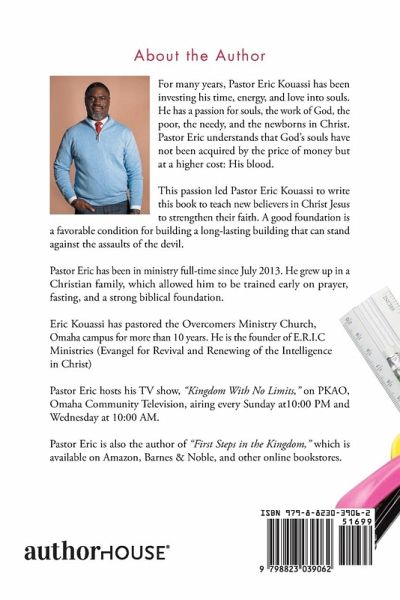 For many years, Pastor Eric Kouassi has been investing his time, energy, and love into souls. He has a passion for souls, the work of God, the poor, the needy, and the newborns in Christ. Pastor Eric understands that God's souls have not been acquired by the price of money but at a higher cost: His blood. This passion led Pastor Eric Kouassi to write this book to teach new believers in Christ Jesus to strengthen their faith. A good foundation is a favorable condition for building a long-lasting building that can stand against the assaults of the devil. Pastor Eric has been in ministry full-time since July 2013. He grew up in a Christian family, which allowed him to be trained early on prayer, fasting, and a strong biblical foundation. Eric Kouassi has pastored the Overcomers Ministry Church, Omaha campus for more than 10 years. He is the founder of E.R.I.C Ministries (Evangel for Revival and Renewing of the Intelligence in Christ) Pastor Eric hosts his TV show, "Kingdom With No Limits," on PKAO, Omaha Community Television, airing every Sunday at10:00 PM and Wednesday at 10:00 AM. Pastor Eric is also the author of "First Steps in the Kingdom," which is available on Amazon, Barnes & Noble, and other online bookstores