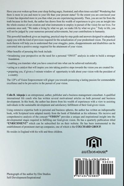Have you ever woken-up from your sleep feeling angry, frustrated, and often times, suicidal? Wondering that there is more in you and more to your life than your present status? To the extent that you are convinced your Creator has deposited more in you than what you are experiencing presently. Then, you are not far from the truth because in this book, the author has drawn from his wealth of experiences both in personal and businesses to give you an insight into the whole essence of our creation and what instruments to employ in pursuit of the vision for our lives. For someone once said, "We make a living by what we get, we make life by what we give." Truly in life, you will not be judged by your numerous personal acheivements, but your contributions to humanity. This powerful handbook gives an inspiring, practical step-by-step guide and answers designed to adequately equip you with the kind of provision required for the actualization of your predestined vision. This practical tools therein will help you to understand that your struggles, pains, disappointments and disabilities can be converted into a positive energy required for the attainment of your vision. Other benefits of perusing this book include: · broadening your perspective on the need for a personal "SWOT" analysis and build a strong foundation. · enabling you translate what you have conceived into what can be achieve realistically. · acting as a catalyst that will inspire you into taking a positive steps towards the vision you are created for.helping you appreciate the true nature of the Creator's promise in relation to your vision. The 12 P's of Vision Empowerment will ginger you towards possessing a lasting passion for commendable excellence and to be pro-active in the pursuit of your vision.
