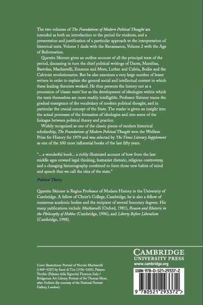 A two-volume study of political thought from the late thirteenth to the end of the sixteenth century, the decisive period of transition from medieval to modern political theory. The work is intended to be both an introduction to the period for students, and a presentation and justification of a particular approach to the interpretation of historical texts. Quentin Skinner gives an outline account of all the principal texts of the period, discussing in turn the chief political writings of Dante, Marsiglio, Bartolus, Machiavelli, Erasmus and more, Luther and Calvin, Bodin and the Calvinist revolutionaries. But he also examines a very large number of lesser writers in order to explain the general social and intellectual context in which these leading theorists worked. He thus presents the history not as a procession of 'classic texts' but are more readily intelligible. He traces by this means the gradual emergence of the vocabulary of modern political thought, and in particular the crucial concept of the State.