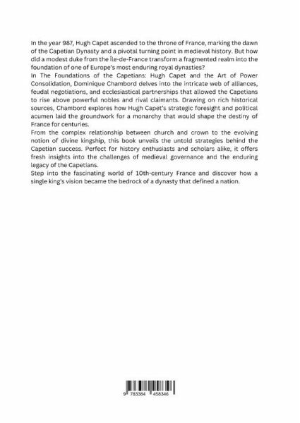 In the year 987, Hugh Capet ascended to the throne of France, marking the dawn of the Capetian Dynasty and a pivotal turning point in medieval history. But how did a modest duke from the Île-de-France transform a fragmented realm into the foundation of one of Europe's most enduring royal dynasties?In The Foundations of the Capetians: Hugh Capet and the Art of Power Consolidation, Dominique Chambord delves into the intricate web of alliances, feudal negotiations, and ecclesiastical partnerships that allowed the Capetians to rise above powerful nobles and rival claimants. Drawing on rich historical sources, Chambord explores how Hugh Capet's strategic foresight and political acumen laid the groundwork for a monarchy that would shape the destiny of France for centuries.From the complex relationship between church and crown to the evolving notion of divine kingship, this book unveils the untold strategies behind the Capetian success. Perfect for history enthusiasts and scholars alike, it offers fresh insights into the challenges of medieval governance and the enduring legacy of the Capetians.Step into the fascinating world of 10th-century France and discover how a single king's vision became the bedrock of a dynasty that defined a nation.