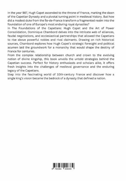 In the year 987, Hugh Capet ascended to the throne of France, marking the dawn of the Capetian Dynasty and a pivotal turning point in medieval history. But how did a modest duke from the Île-de-France transform a fragmented realm into the foundation of one of Europe's most enduring royal dynasties?In The Foundations of the Capetians: Hugh Capet and the Art of Power Consolidation, Dominique Chambord delves into the intricate web of alliances, feudal negotiations, and ecclesiastical partnerships that allowed the Capetians to rise above powerful nobles and rival claimants. Drawing on rich historical sources, Chambord explores how Hugh Capet's strategic foresight and political acumen laid the groundwork for a monarchy that would shape the destiny of France for centuries.From the complex relationship between church and crown to the evolving notion of divine kingship, this book unveils the untold strategies behind the Capetian success. Perfect for history enthusiasts and scholars alike, it offers fresh insights into the challenges of medieval governance and the enduring legacy of the Capetians.Step into the fascinating world of 10th-century France and discover how a single king's vision became the bedrock of a dynasty that defined a nation.
