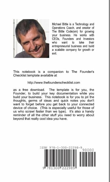 This notebook is a companion to The Founder's Checklist Template available at http://www.thefounderschecklist.com as a free download. The template is for you, the Founder, to build your key documentation while you build your business. This notebook is for you to jot the thoughts, germs of ideas and quick notes you don't want to forget before you get back to your connected device of choice. This is especially useful for those of us who scrawl faster than we type. It's also a handy reminder of the other stuff you need to worry about beyond that really cool idea you have.