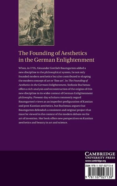 When, in 1735, Alexander Gottlieb Baumgarten added a new discipline to the philosophical system, he not only founded modern aesthetics but also contributed to shaping the modern concept of art or 'fine art'. In The Founding of Aesthetics in the German Enlightenment, Stefanie Buchenau offers a rich analysis and reconstruction of the origins of this new discipline in its wider context of German Enlightenment philosophy. Present-day scholars commonly regard Baumgarten's views as an imperfect prefiguration of Kantian and post-Kantian aesthetics, but Buchenau argues that Baumgarten defended a consistent and original project which must be viewed in the context of the modern debate on the art of invention. Her book offers new perspectives on Kantian aesthetics and beauty in art and science.