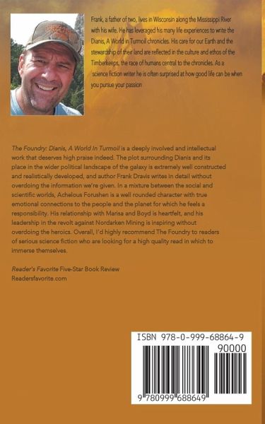 Living on the banks of the Mississippi River, Frank Dravis has leveraged his many life experiences to write the Dianis, A World in Turmoil chronicles. He was born and raised in Detroit, Michigan where he and his father cruised the Great Lakes. They often chose to go out on only the roughest days when there was no traffic. Frank spent six years in the US Navy chasing Soviet submarines. His love of the sea is reflected in the chronicles, a love he has shared with his wife and two girls. A hunter, Frank has taken game with a variety of weapons, including the bow, rifle, shotgun, and muzzleloader the weapon developed by Ogden on Dianis the tool of choice in the fight against galactic extrasolars. Frank aids his wife in her passion for horses as stable hand and riding partner of Suzette, his paint. Equines regularly appear in the Dianis series, not as horses, but as eenus. Frank's care for Earth and the stewardship of their land in Wisconsin are reflected in the culture and ethos of the Timberkeeps. He has two degrees, a Bachelor of Computer Science, and a Master of Business Administration. Those degrees have been integral to his other career roles from software engineer to marketing executive, to chief information officer. The technical and scientific acumen he gained through those endeavors is demonstrated in the series in the effort to make the Dianis brand of science practically possible somewhere in the galaxy today.