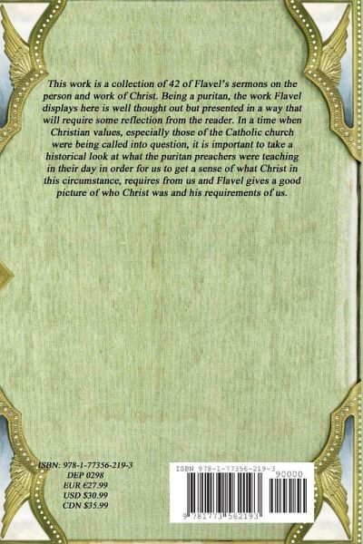 This work is a collection of 42 of Flavel's sermons on the person and work of Christ. Being a puritan, the work Flavel displays here is well thought out but presented in a way that will require some reflection from the reader. In a time when Christian values, especially those of the Catholic church were being called into question, it is important to take a historical look at what the puritan preachers were teaching in their day in order for us to get a sense of what Christ in this circumstance, requires from us and Flavel gives a good picture of who Christ was and his requirements of us.