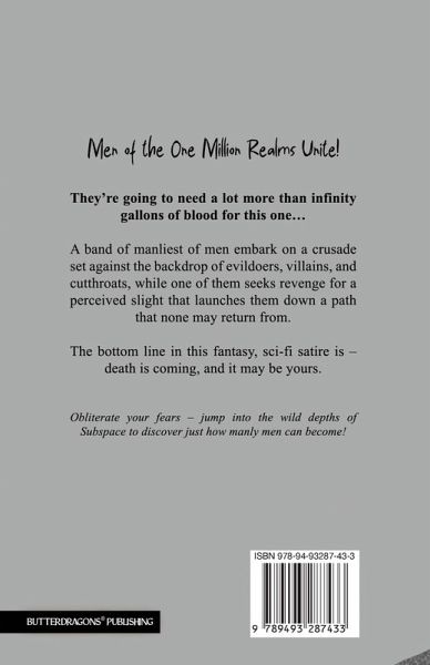 They're going to need a lot more than infinity gallons of blood for this one... A band of manliest of men embark on a crusade set against the backdrop of evildoers, villains, and cutthroats, while one of them seeks revenge for a perceived slight that launches them down a path that none may return from. The bottom line in this fantasy, sci-fi satire is - death is coming, and it may be yours. Obliterate your fears - jump into the wild depths of Subspace to discover just how manly men can become! Disclaimer:This novel is satirical in nature - allow me to spread the jam out on the toast for you on this one:This novel contains mature, "badass" material and themes that some readers will find highly offensive but mostly cool. Expect bad words said by grownups, potty words, blood, guts, and more than one reference to sexual bits, actions, and/or orientations, most of which will likely be used in derogatory or otherwise offensive manners. Social insult and generally offensive behavior is part of the subtext of this story. Begin this text with the expectation that big angry men are running to where you are right now to hurt your feelings, because they are. This is intended for audiences of sixteen years or older, though every human develops at different paces of tolerance. Sexuality, Ability, Ethnicity, Culture, and more are all on the chopping block in order to provide the most appropriately accurate "Subspace" experience as possible.Use your own discretion. You have been warned.