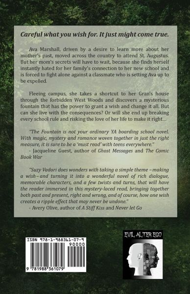 Careful what you wish for. It just might come true. Ava Marshall, driven by a desire to learn more about her mother's past, moved across the country to attend St. Augustus. But her mom’s secrets will have to wait, because she finds herself instantly hated for her family’s connection to her new school and is forced to fight alone against a classmate who is setting Ava up to be expelled. Fleeing campus, she takes a shortcut to her Gran’s house though the forbidden West Woods and discovers a mysterious fountain that has the power to grant a wish and change it all. But can she live with the consequences? Or will she end up breaking every school rule and risking the love of her life to make it right…