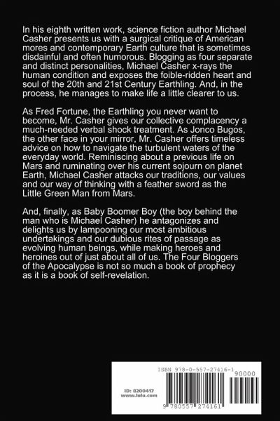 In his eighth book, Michael Casher presents a surgical critique of American mores and contemporary Earth culture that is sometimes disdainful and often humorous. Blogging as four separate personalities, Mr. Casher x-rays the human condition and exposes the foible-ridden heart and soul of the 20th and 21st Century Earthling. As Fred Fortune, he gives our collective complacency a much-needed verbal shock treatment. As Jonco Bugos, he offers timeless advice on how to navigate the turbulent waters of the everyday world. As Little Green Man from Mars, he attacks our traditions, our values and our way of thinking with a feather sword. And, finally, as Baby Boomer Boy, Michael Casher antagonizes and delights us by lampooning our most ambitious undertakings and our dubious rites of passage as evolving human beings, while making heroes and heroines out of just about all of us. The Four Bloggers of the Apocalypse is not so much a book of prophecy as it is a book of self-revelation. Copyright © 2010. 1st Ed. 03-29-10.