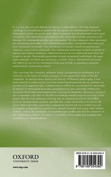 E. J. Lowe, a prominent figure in contemporary metaphysics, sets out and defends his theory of what there is. His four-category ontology is a metaphysical system which recognizes four fundamental categories of beings: substantial and non-substantial particulars and substantial and non-substantial universals. Lowe argues that this system has an explanatory power which is unrivaled by more parsimonious theories and that this counts decisively in its favor. He shows that it provides a powerful explanatory framework for a unified account of causation, dispositions, natural laws, natural necessity and many other related matters, thus constituting a full metaphysical foundation for natural science.
