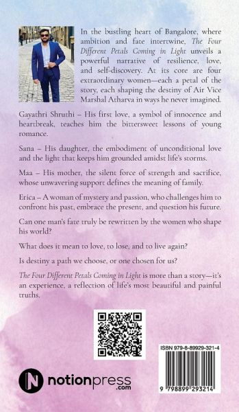 In the bustling heart of Bangalore, where ambition and fate intertwine, The Four Different Petals Coming in Light unveils a powerful narrative of resilience, love, and self-discovery. At its core are four extraordinary women-each a petal of the story, each shaping the destiny of Air Vice Marshal Atharva in ways he never imagined. Gayathri Shruthi - His first love, a symbol of innocence and heartbreak, teaches him the bittersweet lessons of young romance. Sana - His daughter, the embodiment of unconditional love and the light that keeps him grounded amidst life's storms. Maa - His mother, the silent force of strength and sacrifice, whose unwavering support defines the meaning of family. Erica - A woman of mystery and passion, who challenges him to confront his past, embrace the present, and question his future. Can one man's fate truly be rewritten by the women who shape his world? What does it mean to love, to lose, and to live again? Is destiny a path we choose, or one chosen for us? The Four Different Petals Coming in Light is more than a story-it's an experience, a reflection of life's most beautiful and painful truths.
