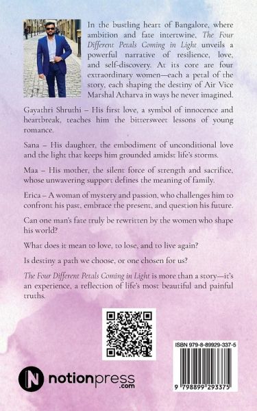 In the bustling heart of Bangalore, where ambition and fate intertwine, The Four Different Petals Coming in Light unveils a powerful narrative of resilience, love, and self-discovery. At its core are four extraordinary women-each a petal of the story, each shaping the destiny of Air Vice Marshal Atharva in ways he never imagined. Gayathri Shruthi - His first love, a symbol of innocence and heartbreak, teaches him the bittersweet lessons of young romance. Sana - His daughter, the embodiment of unconditional love and the light that keeps him grounded amidst life's storms. Maa - His mother, the silent force of strength and sacrifice, whose unwavering support defines the meaning of family. Erica - A woman of mystery and passion, who challenges him to confront his past, embrace the present, and question his future. Can one man's fate truly be rewritten by the women who shape his world? What does it mean to love, to lose, and to live again? Is destiny a path we choose, or one chosen for us? The Four Different Petals Coming in Light is more than a story-it's an experience, a reflection of life's most beautiful and painful truths.