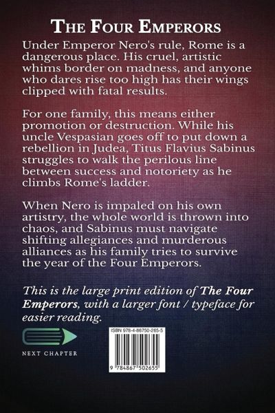 Under Emperor Nero's rule, Rome is a dangerous place. His cruel, artistic whims border on madness, and anyone who dares rise too high has their wings clipped with fatal results. For one family, this means either promotion or destruction. While his uncle Vespasian goes off to put down a rebellion in Judea, Titus Flavius Sabinus struggles to walk the perilous line between success and notoriety as he climbs Rome's ladder. When Nero is impaled on his own artistry, the whole world is thrown into chaos, and Sabinus must navigate shifting allegiances and murderous alliances as his family tries to survive the year of the Four Emperors. This is the large print edition of The Four Emperors, with a larger font / typeface for easier reading.